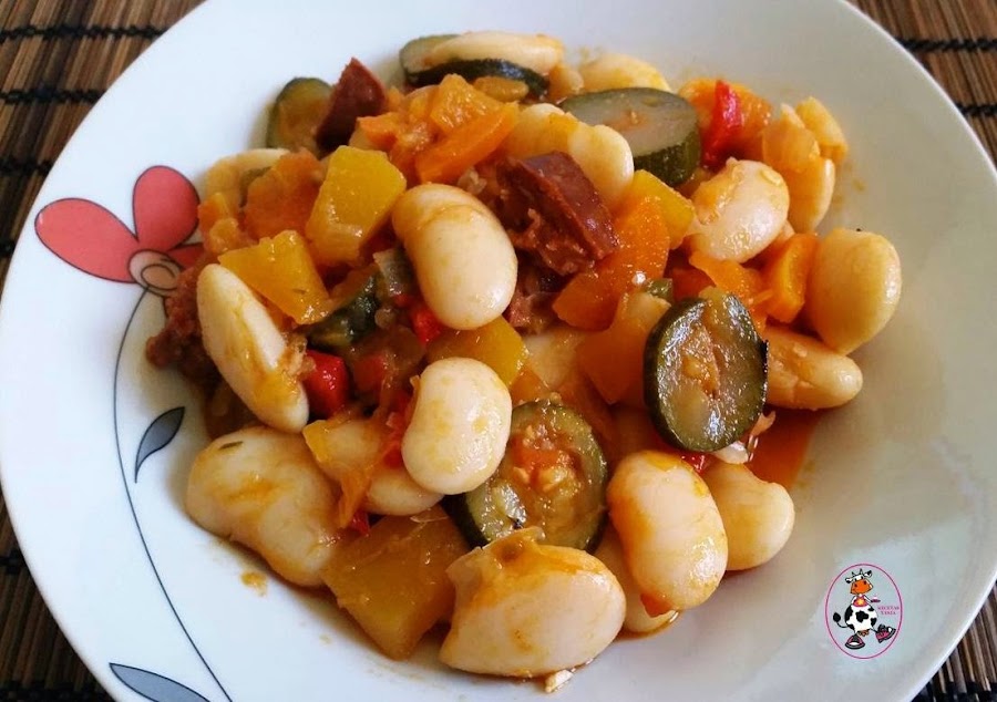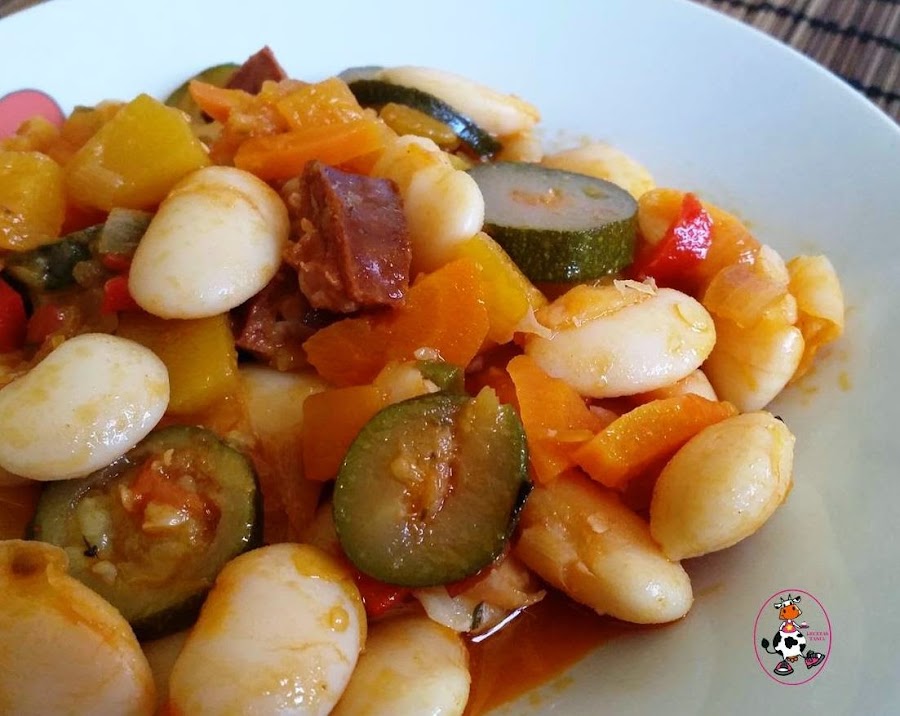 En un caldero ponemos un chorrito de aceite de oliva y añadimos los dientes de ajo, la cebolla y el pimiento rojo picadito. Sofreímos y ponemos un poco de tomillo y una hoja de laurel y troceamos el chorizo y se lo añadimos. Vamos añadiendo las verduras troceadas,primero la zanahoria luego el calabacin y la calabaza.junto con el vino blanco, el vaso de agua y dejamos que se ponga tierna la verdura. Cuando las verduras estén tiernas ponemos una cucharada de pimentón, un poquito de sal y añadimos las judías,mezclamos bien todos los ingredientes y dejamos a fuego bajo unos 10min. Apagamos el fuego y dejamos reposar.