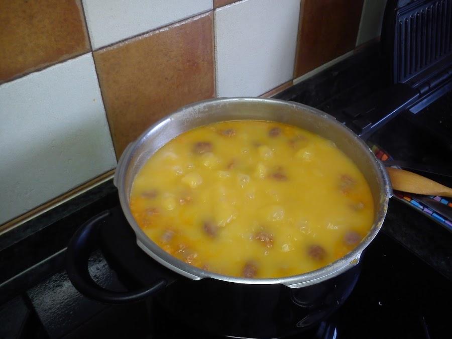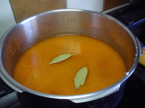Se deja que arranque a hervir a fuego fuerte y cuando comienza se baja a fuego medio para que hierva 45-50 minutos removiendo de vez en cuando. Si bajáis mucho el fuego veréis que el caldo hierve pero el aceite se queda en el borde y lo que queremos es que hierva todo junto para que coja buen sabor.