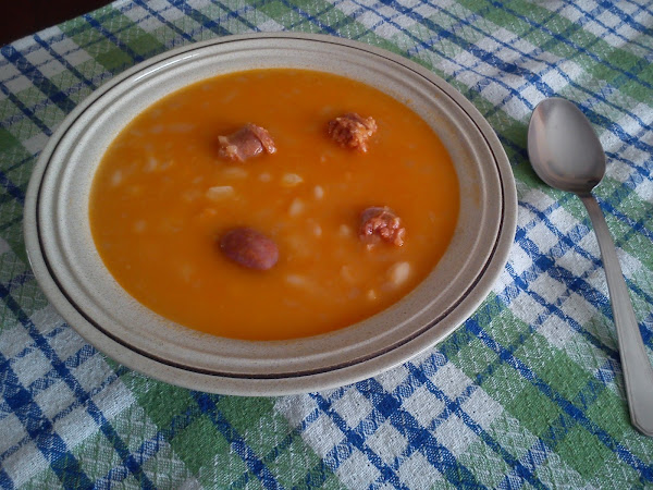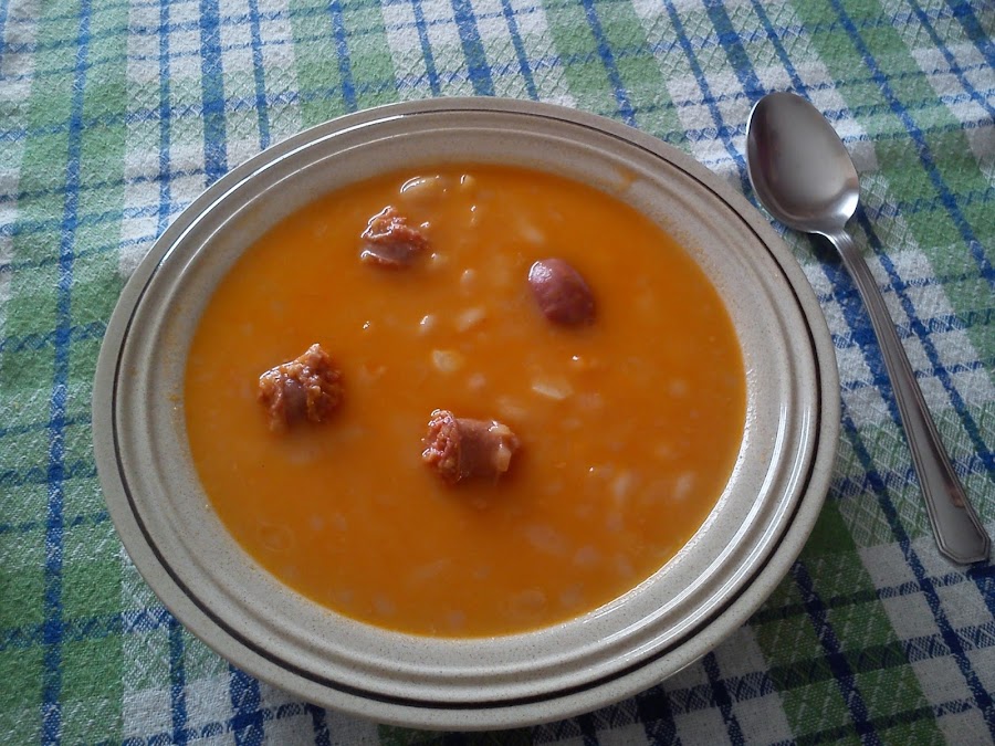 Es un plato sencillo pero riquísimo y muy fácil de preparar porque lo hago con alubias blancas de bote, o sea ya cocidas, y caldo de pollo de brick o se puede hacer con pastilla de concentrado de carne pero a mí me gusta más el caldo de brick. Utilizo chorizos frescos, depende del tamaño los corto o no, pero no me gusta tenerlos que partir en el plato prefiero trocearlos antes y luego que me quepan en la cuchara, manías de una, je, je.