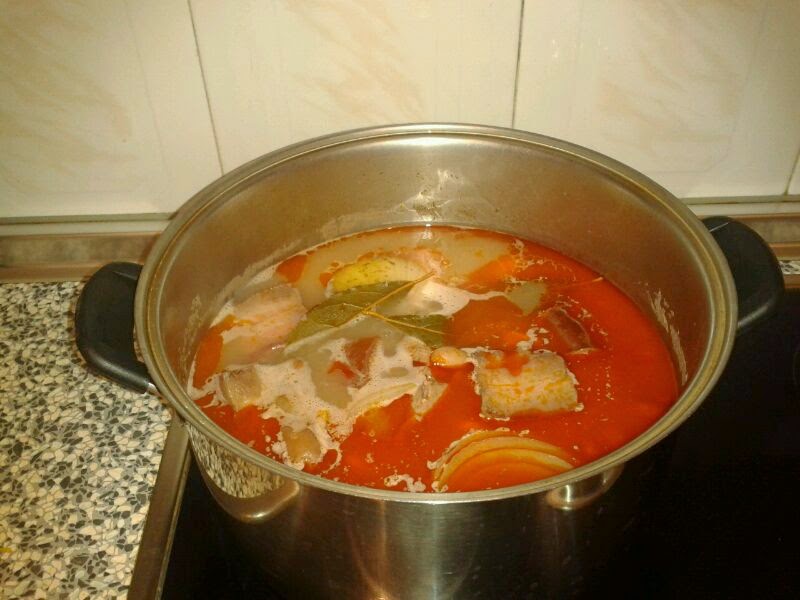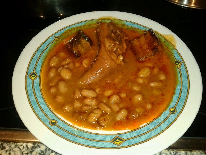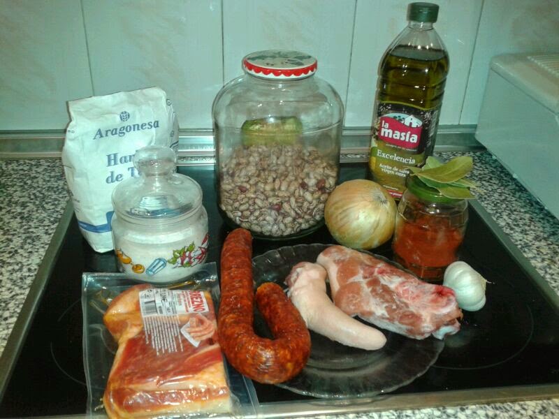 Al día siguiente se les quita el agua y se echan en una olla junto con la media cebolla, los cuatro dientes de ajos pelados, el laurel, el rabo de cerdo, la panceta y el chorizo, estos dos últimos ingredientes cortados en varios trozos. Lo tenemos a fuego medio durante hora y media.