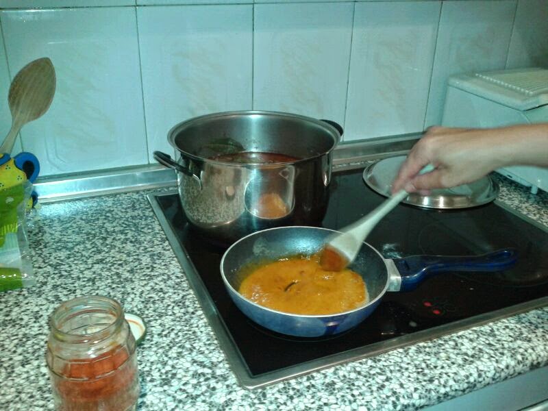 Pasado este tiempo se hace el arreglo de las judías esto consiste en echar en una sartén un poco de aceite con una cuchara de harina cuando vemos que ya está cocinada, apagamos el fuego y le añadimos la sal y una cucharada de postre de pimentón. Se da varias vueltas y se lo añadimos a la cacerola.
