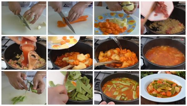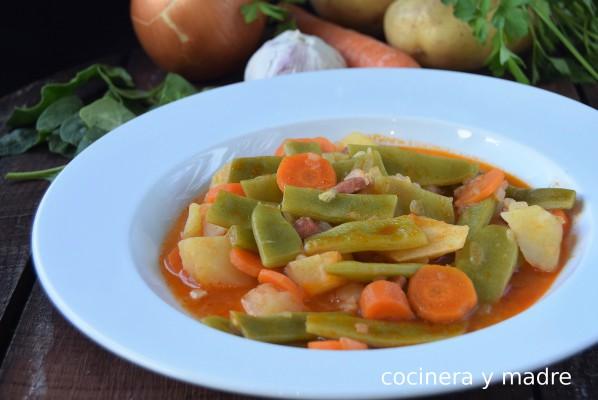 Tenemos que dejarlo hasta que las patatas y las zanahorias estén bien echas y las judías verdes “al dentes” es decir que estén cocidas pero con cierta dureza; si os gusta más cocido tan solo dejarlo unos minutos más.