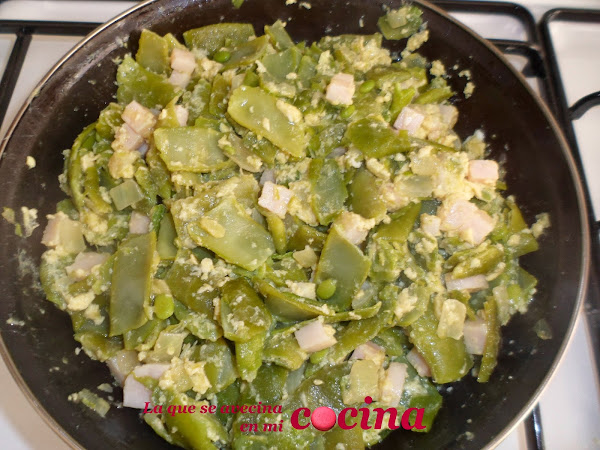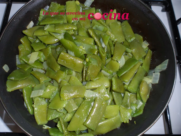 En el momento en el que la cebolla esté transparente, añadiremos las judías y las dejaremos para que cojan el gusto de la cebolla. Vamos removiendo un poco.