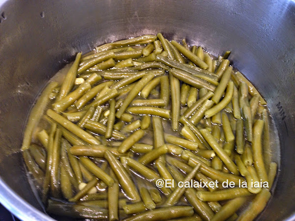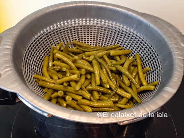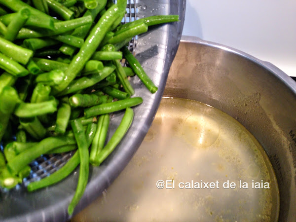 para potenciar el color verde añado una puntita cuanto apenas de bicarbonato de sodio, que no aporta sabor alguno. Tapamos la olla y ladejamos unos ocho minutos a partir de que salga la válvula. Estas judías no han de quedar blandas, el punto ideal es al dente porque luego con el tomate se acaban de hacer