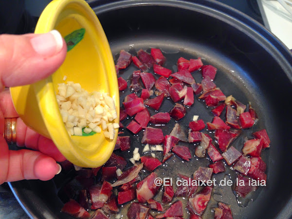 Mientras, ponemos aceite en otra cazuela o sartén y doramos un poco el jamón