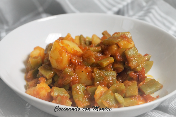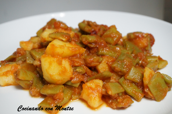 Judías verdes con patatas y tomate, un plato sencillo y muy apetecible después de estas fiestas. Un estupendo plato con una combinación estupenda, con tomate frito.
