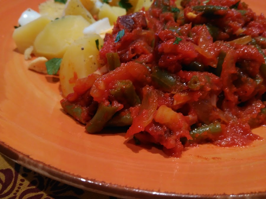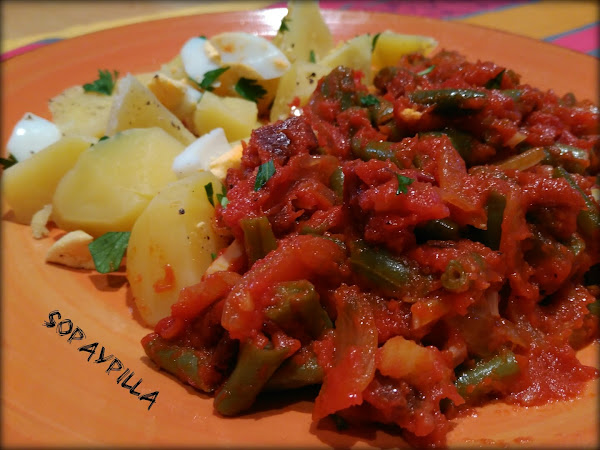 - Cuando la salsa de tomate haya reducido un poco, añadimos las judías cortaditas y salpimentamos. (Ojo con la sal, que ya lleva del jamón) dejamos saltear unos minutos.