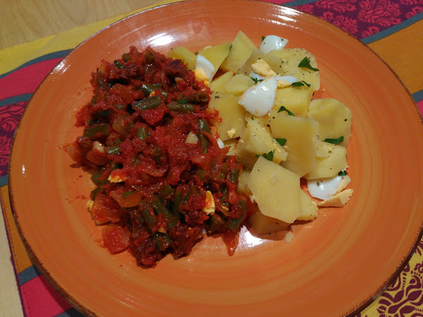 - Pelar las patatas, lavar las judías y cocerlas juntas al vapor unos 20 minutos (Si no tenéis manera de hacerlas al vapor, hervidas también vale) Escurrir y reservar por separado.
