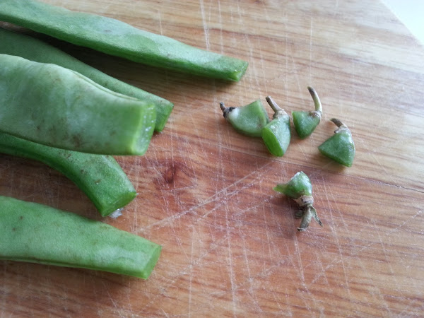 3. - Las judías las enjuagamos, les quitamos el "rabillo" y las troceamos.