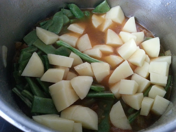 6. - Le añadimos las judías y las patatas troceadas y le agregamos un vaso de agua, unos 200 ml. y sazonamos. Lo tapamos y dejamos cocer a fuego medio unos 20 minutos, o hasta que estén tiernas.