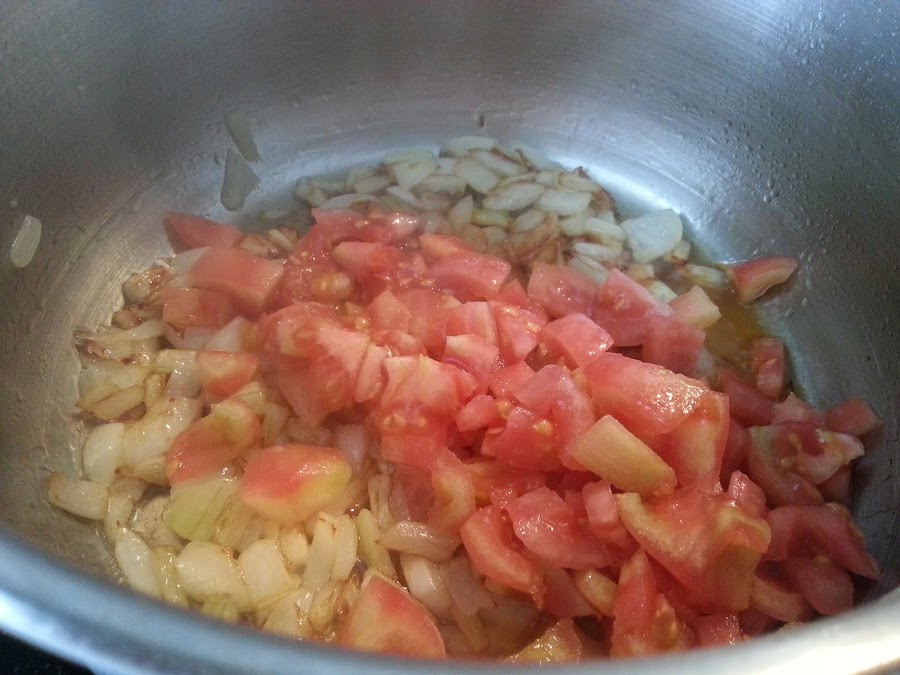 5. - Cuando la cebolla ya esté dorada, le agregamos el tomate y dejamos hacer 5 minutos más.