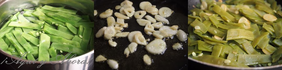 En una sartén con aceite doramos los ajos cortado en laminas finas, añadimos las judías verdes cocidas y las rehogamos.