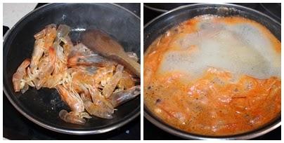 Pelamos los langostinos y hacemos un caldo con las cabezas y patas.Lo escurrimos y reservamos.