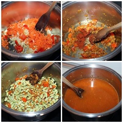 En una cazuela ponemos el aceite de oliva y sofreímos las cebolla, ajos , pimiento y las zanahorias durante 10 minutos, añadimos una cucharadita de pimentón y las hebras de azafrán. Removemos sin que se queme el pimentón.