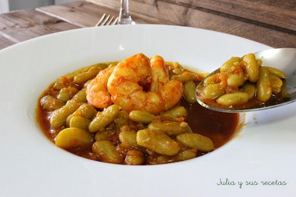 Servimos las judías en el plato con los langostinos en el centro.