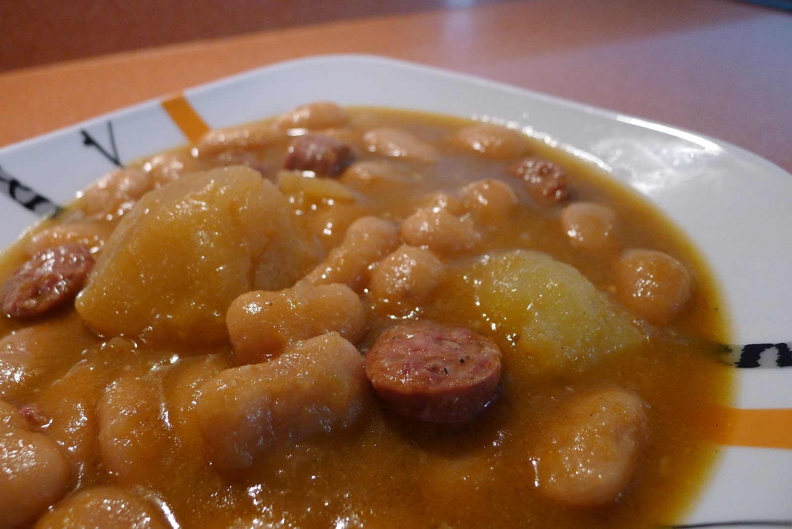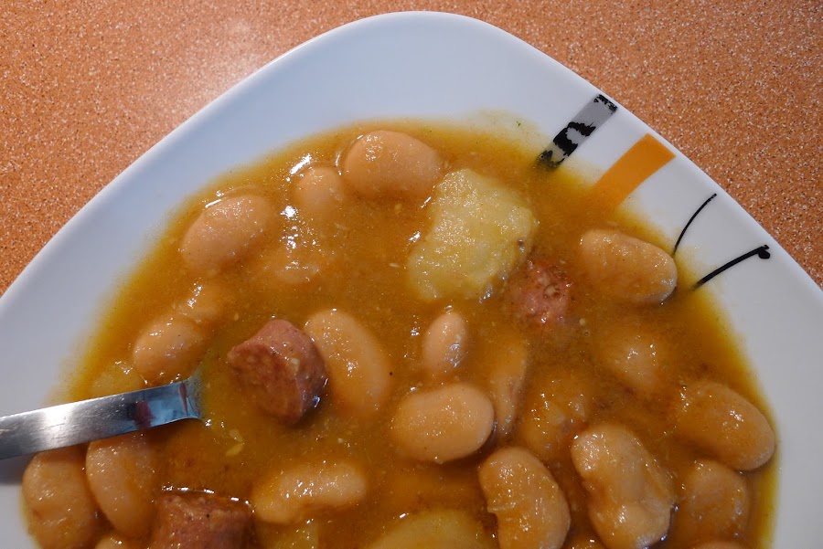 Una vez terminadas,le añadimos las patatas reservadas,que las desharemos en trozos.Y en una sarten aparte,pelamos los dos dientes de ajo y los freimos enteros en un poco de aceite,una vez dorados,apartamos y los batimos junto a un cucharon de judias con su caldo,lo añadimos al potaje,chup chup y ...a disfrutar se ha dicho!...os animais con el?