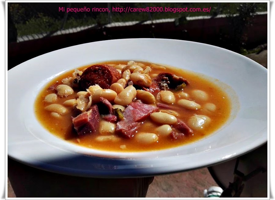 Agregar al caldo y remover. De esta manera el líquido quedará más ligado y los judiones más consistentes, sacamos la panceta, los chorizos y lo troceamos y añadimos al guiso, presentarlo a la mesa bien caliente y lista para servir.