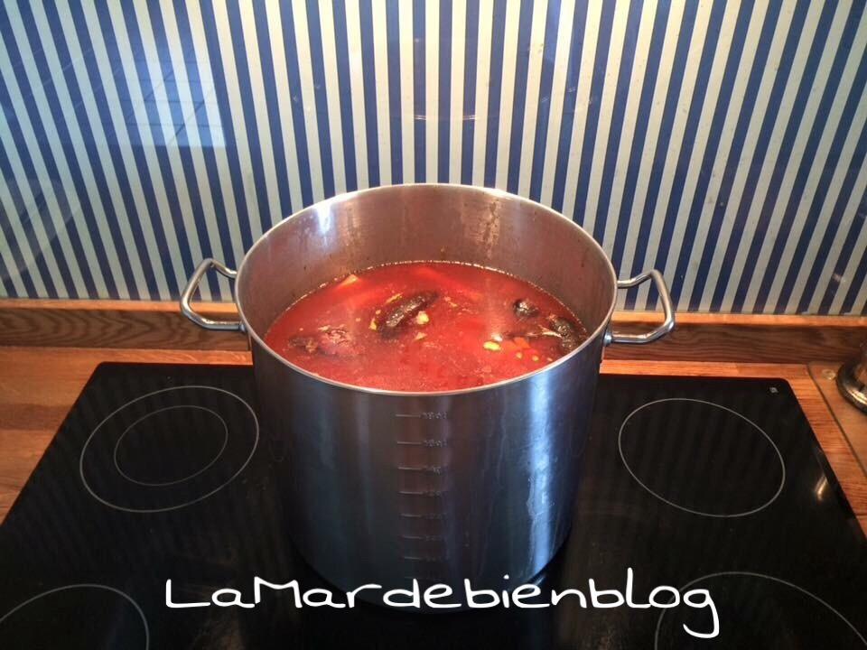 Poner a fuego lento como tres horas añadiendo agua fría de vez en cuando para asustarlas y para que no se consuma el caldo.
