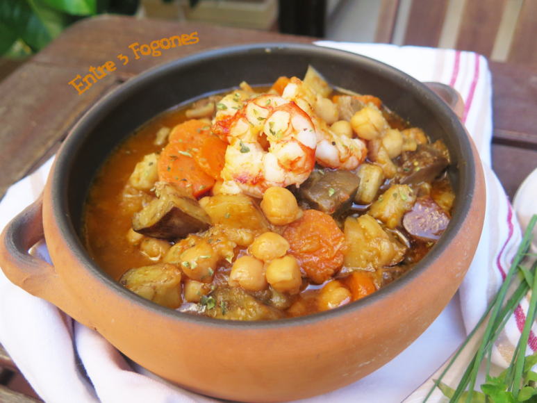 Otro rico plato de legumbres que puedes poner este potaje de garbanzos con berenjenas y gambas que nos deja el blog Entre 3 fogones