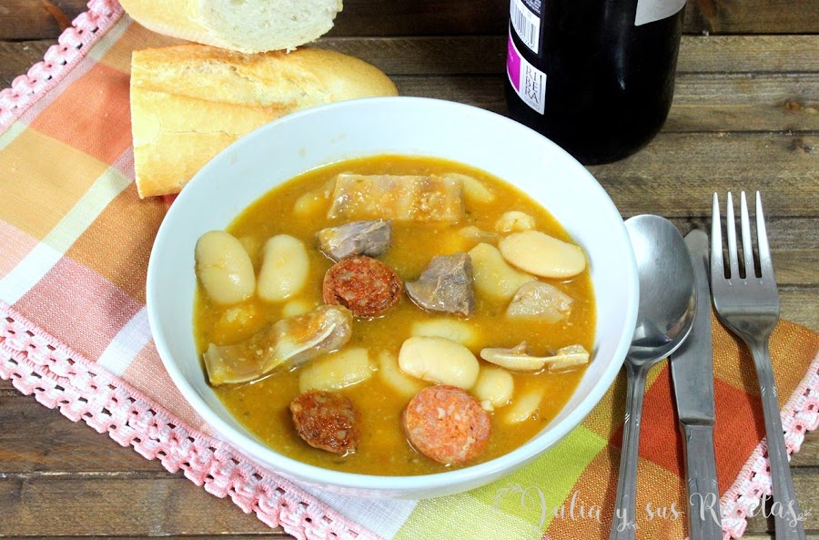 Lo servimos todo calentito, con la carne, la oreja y el chorizo troceados. Si las dejas reposar durante 24 horas aún estarán más ricas.