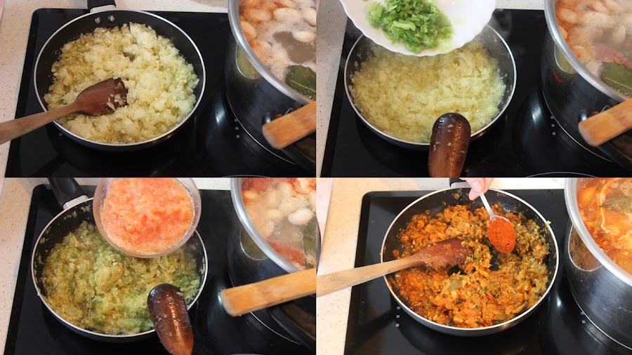 Mientras hierven picamos los ajos,la cebolla, el perejil, el tomate y el pimiento muy finitos, lo freímos a fuego lento hasta que estén sofritos. Le añadimos el pimentón y le damos unas vueltas.