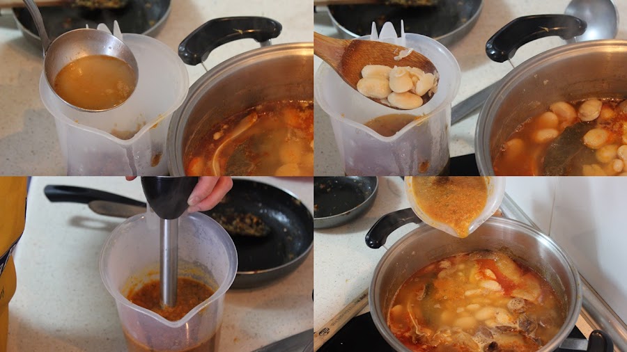 Lo ponemos en el vaso de la batidora, le añadimos un poco de caldo de cocer los judiones y 3-4 judiones, lo trituramos con la batidora y se lo incorporamos a los judiones.