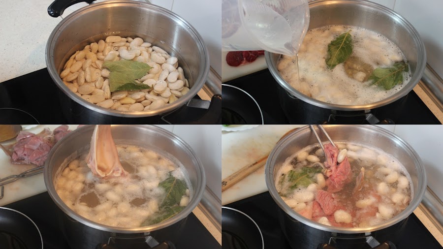 Los escurrimos y los ponemos en una olla cubiertos de agua fría, los ponemos al fuego junto con el laurel. Cuando empiecen a hervir les echamos un poquito de agua fría y cuando rompan a hervir otra vez, añadimos la oreja , la carne y el chorizo , todo entero.