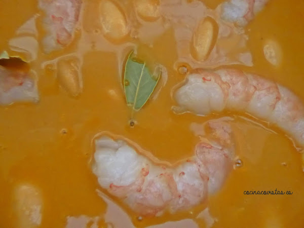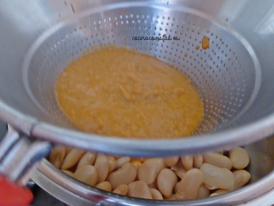 Apagamos el fuego y pasamos el contenido de la sartén a un bol hondo (o vaso de batidora), para que no salpique pues esto lo trituramos con la batidora bien, bien.Escurrimos los judiones y sobre ellos y a través del chino pasamos la salsa que hemos obtenido con la cabeza y cáscaras de los langostinos, ponemos la hoja de laurel y rectificamos de sal.