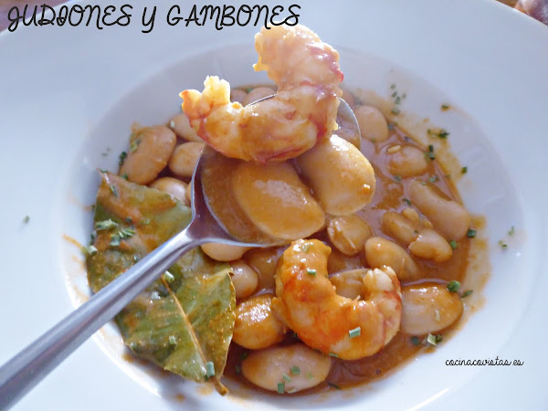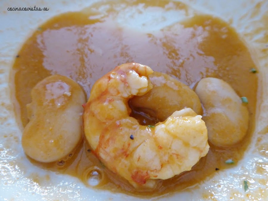 Ponemos la cazuela con los judiones y la salsa al fuego y colocamos encima los langostinos que teníamos reservados.