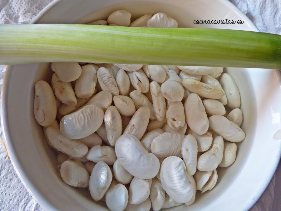 Escurrimos los judiones y los ponemos a cocer en agua fría con un puerro y sal (en la olla 25 minutos).