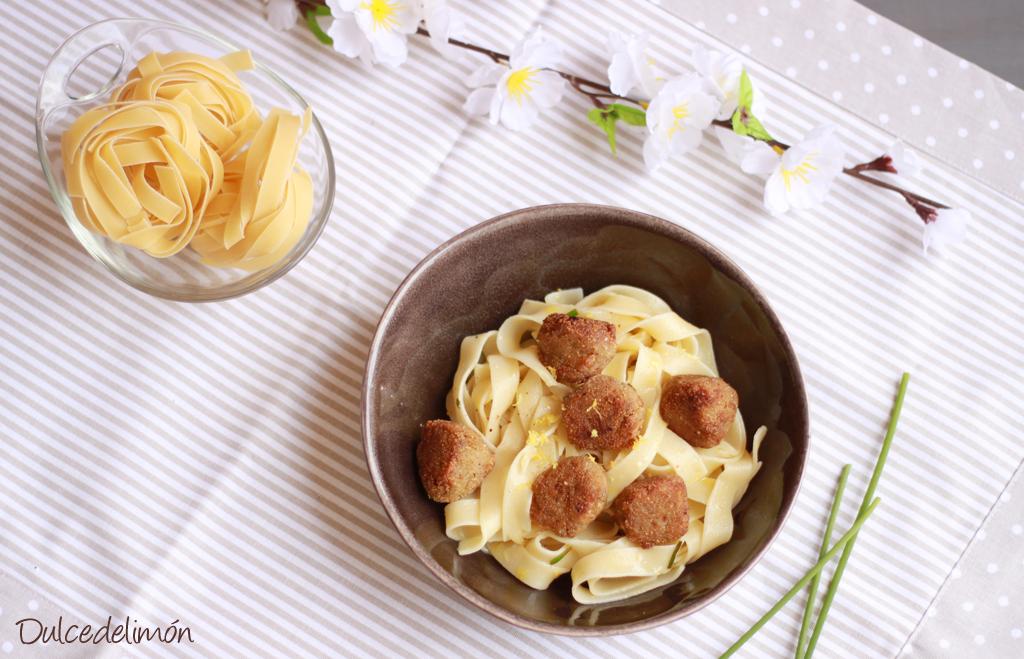 Solo nos quedará servir la receta. Colocaremos la pasta en el plato y sobre ella las albóndigas. Terminaremos con un chorrito de aceite de oliva y con un poco más de ralladura de limón. ¡Listo!