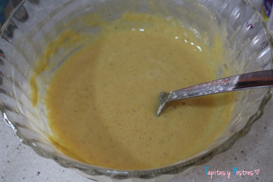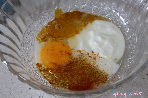 En una fuente ponemos el yogur, el huevo, el zumo de limón, las especias, sal, pimienta y mezclamos muy bien.