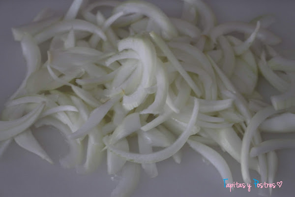 Cortamos la cebolla en tiras y luego troceamos en trozos de unos 2 o 3 centímetros.