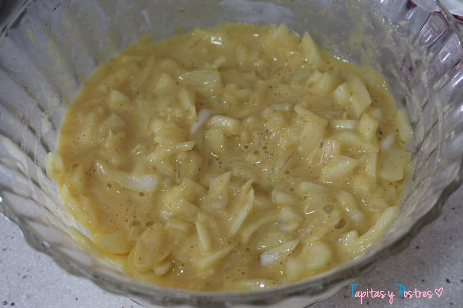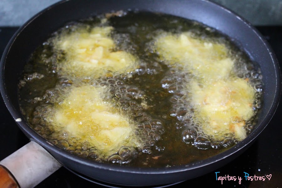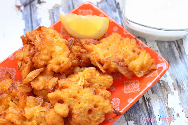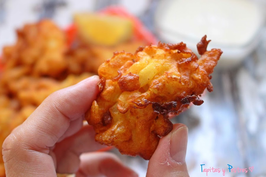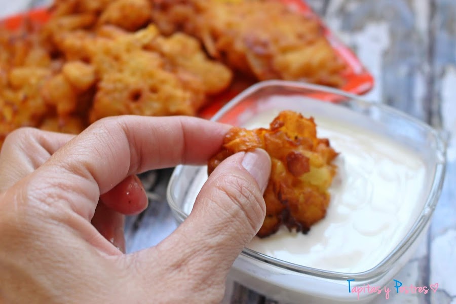 Ponemos aceite a calentar y cuando esté bien caliente pero sin echar humo, vamos echando cucharadas de la masa de cebolla. Cuando pasen unos minutos, damos la vuelta para que se dore por los dos lados.