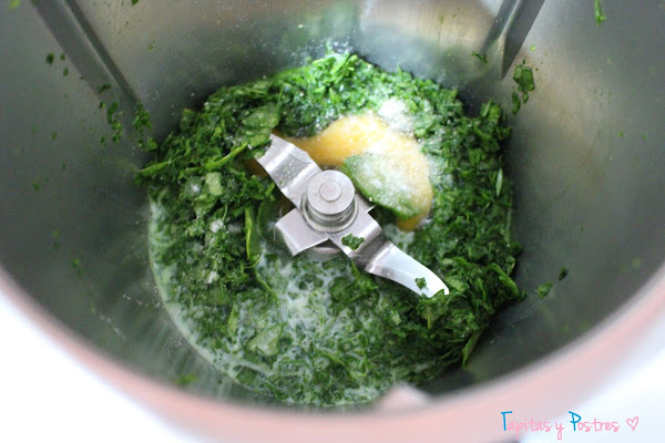 Comenzamos preparando la masa de los creps. En el vaso de la thermomix o de una batidora eléctrica ponemos las espinacas lavadas y las trituramos 30 segundos a velocidad 8. Agregamos el huevo, leche, harina, sal y pimienta y volvemos a triturar 20 segundos a velocidad 5. Debe quedarnos una crema homogénea. Si veis que quedan restos de espinacas sin triturar, volvemos a batir. Dejamos reposar mientras hacemos el relleno.