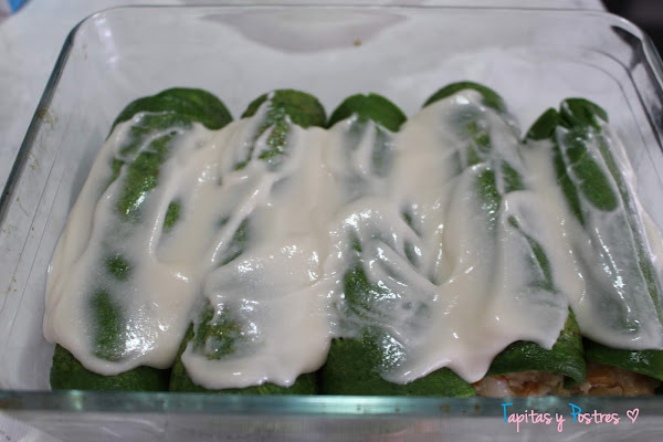 Enrollamos y colocamos en una bandeja de horno. Ponemos un poco de bechamel encima y queso rallado. Al horno.