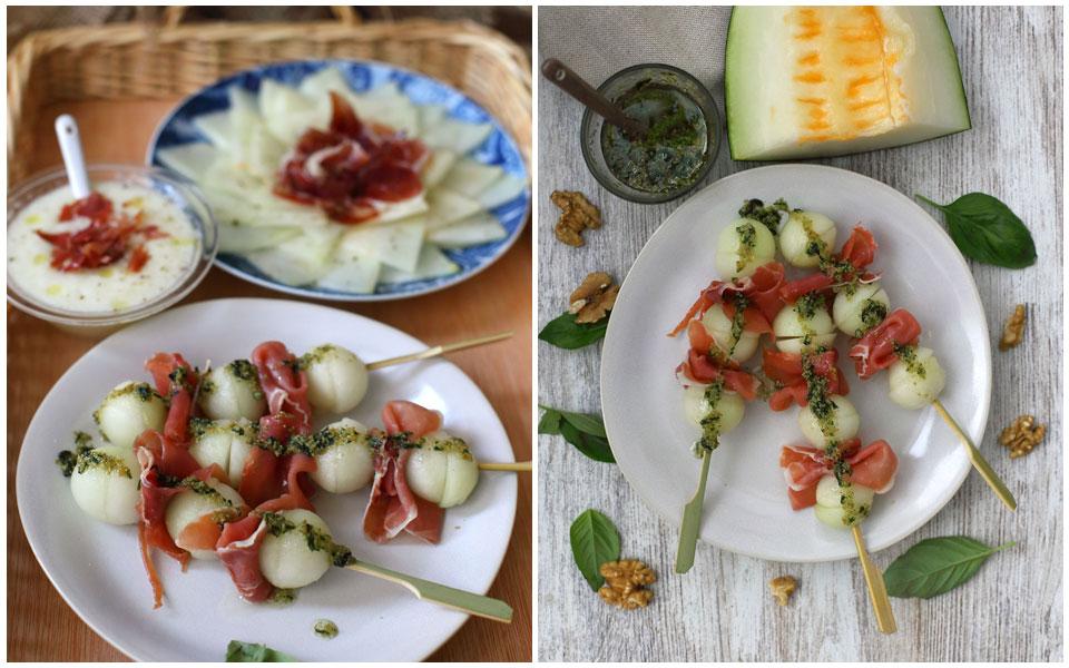 La tercera es, simplemente es-pec-ta-cu-lar: unos pinchos de bolitas de melón con jamón con pesto de nueces.