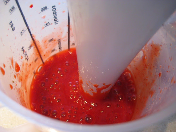Triturar con la batidora y quitarle las pepitas con un colador si fuera necesario. Reservar un poco de esta mezcla para hacer la mermelada.