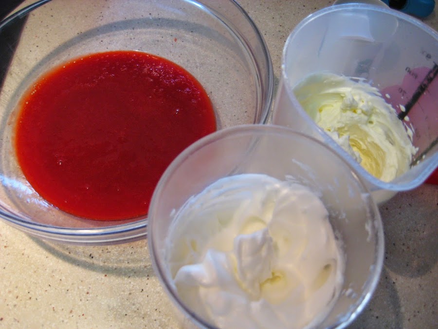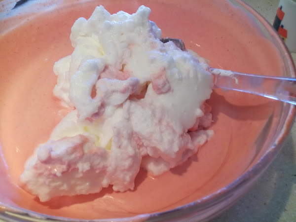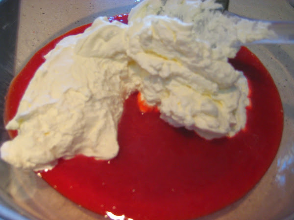 Pondremos las 2 láminas de gelatina en agua fría y dejar 5 minutos y agregárselas a las fresas trituradas que estarán a fuego ir removiendo hasta que se disuelva, antes de que empiece a hervir apagar y dejar enfriar, mezclar con la nata (crema de leche) y a continuación con las claras a punto de nieve, suavemente y con pases envolventes.