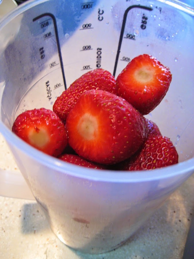 Se lavan las fresas y se le quita el rabito, las troceamos.