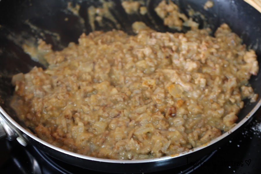 Mientras se asan los pimientos preparamos el relleno, En una sarten grande ponemos el aceite y doramos el ajo y la cebolla muy picadito todo. Cuando esté transparente la cebolla añadimos la carne y salteamos hasta que se haga. Agregamos el tomate frito y salpimentamos al gusto. Damos una vueltas y echamos ahora la harina. Removemos un par de minutos para que la harina pierda el sabor a crudo. Calentamos la leche y la incorporamos junto a la nuez moscada, removiendo constantemente hasta que se forme una masa espesa.