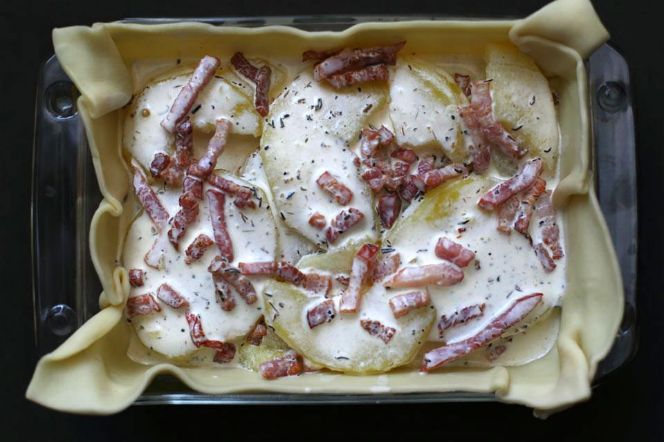 Dividimos la lámina de hojaldre en dos partes, de manera que una nos cubra completamente el molde que rellenaremos y la otra sirva como tapa de la tarta. Recubrimos el molde con la primera parte del hojaldre. Dentro pondremos las patatas con toda su salsa.