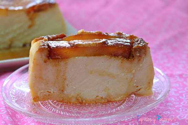 Ponemos caramelo liquido en un molde. Colocamos tres rodajas en el fondo. Reservamos.