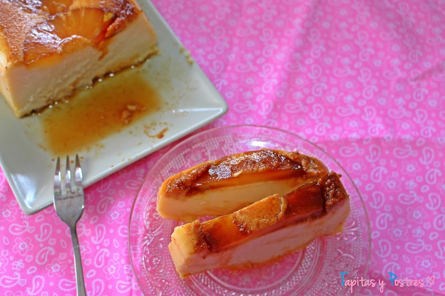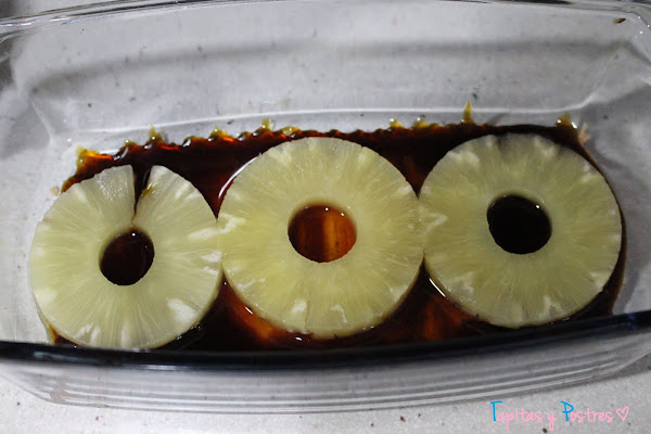 Colocamos sobre el caramelo tres rodajas de piña y reservamos las que sobren.