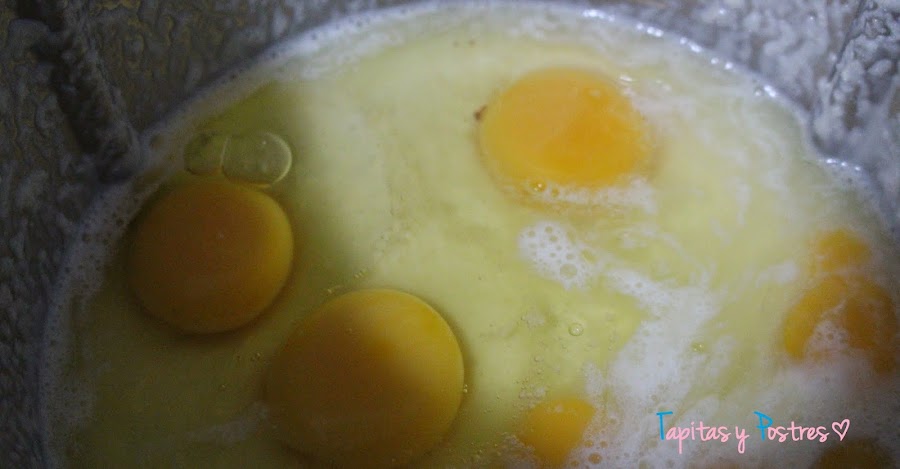 Echamos en el vaso de la thermomix el pan de molde, la leche condensada, las rodajas de piña que sobraron mas las de la otra lata, 100 ml de jugo de piña y 100 ml de agua. Trituramos todo esto 30 segundos a velocidad 6. Añadimos los huevos y volvemos a batir 30 segundos a velocidad 6. Todo esto se puede hacer con una batidora eléctrica.