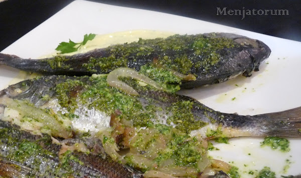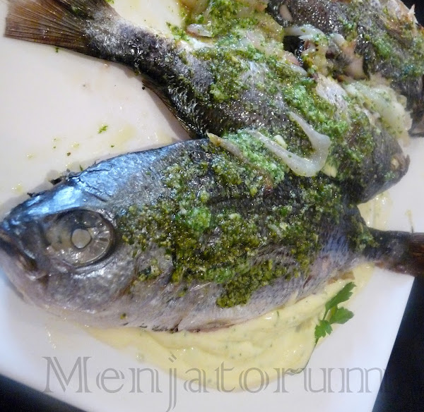 Hacer una picada en un mortero con un buen manojo de perejil bien picado,aceite de oliva, un par de ajos, sal, pimienta y un poco de caldo del pescado del horno.