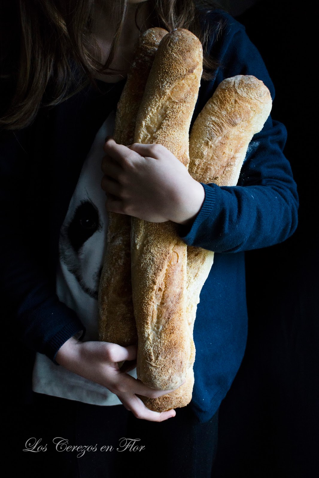 Hacer pan es como un pequeño milagro, y ahora que tenemos a la vuelta de la esquina el día de Reyes como que traeros ésta receta venía que ni pintada. Con tan sólo cuatro ingredientes podemos hacer magia en la cocina y crear un producto básico en nuestra alimentación. Un poco de tiempo, otro poco de amasado y un horno son suficientes para hacer el mejor milagro de la historia. Y además que los ingredientes son fáciles de conseguir, ni siquiera la harina supone un gran problema pues cómo dice muy bien Julia tenemos que utilizar harina común, ya que tiene un contenido más bajo en gluten y va perfecto para el buen desarrollo de la receta. Cuando le comentaba a mi madre que llevaba todo el día liada haciendo pan se ponía las manos en la cabeza diciéndome que me lío más que la pipa de un indio, pero en realidad no es así. Es sólo cuestión de esperar, y cumplir con todos los tiempos de levado, trabajo lo que dice trabajo hay muy poco. Y aunque hubiera tenido que pasarme horas de pie en la cocina, el resultado es tan espectacular que hubiera merecido la pena. Salen unas baguettes crujientes, deliciosas y como si un panadero profesional las hubiera preparado. En las explicaciones que os doy para dar forma al pan os voy a remitir al vídeo porque como siempre digo, una imagen vale más que mil palabras. Y os digo que lo hagáis tal y como indica el maestro panadero francés, salen perfectas y ya nunca más amasaréis de otra forma. Te aseguras que mantenga la forma para los siglos de los siglos. Nos ponemos con la receta? Yo creo que sí, porque el proceso es bastante largo, contar con unas 7 horas desde que comenzamos hasta que las sacamos del horno, así que no perdamos más tiempo, a ponerse el delantal!!