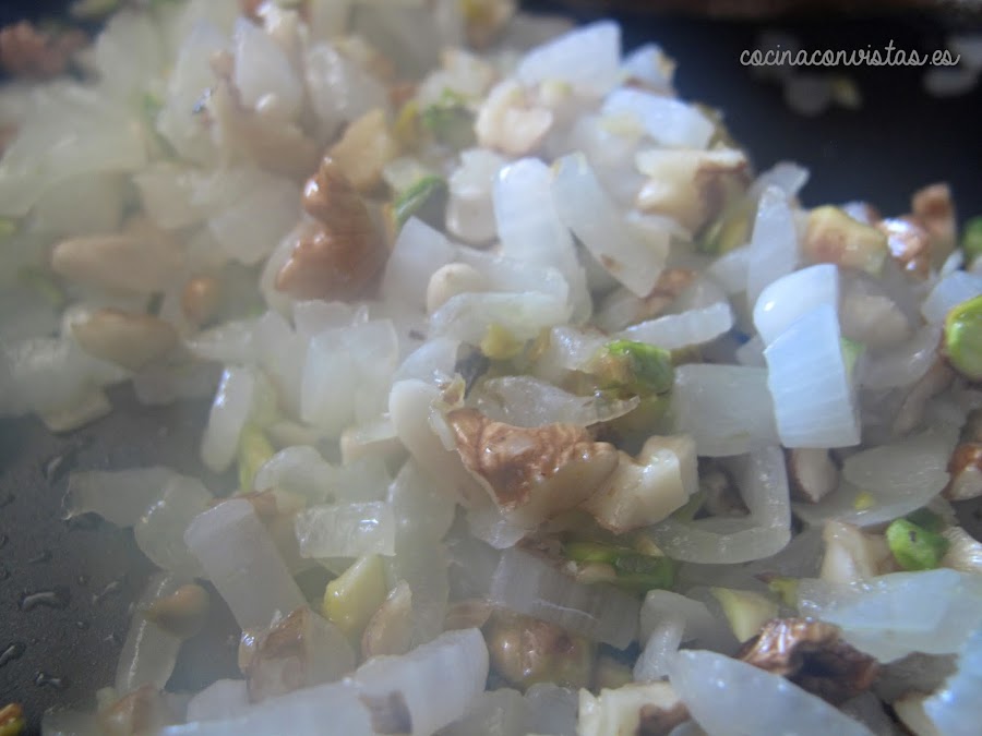 Calentar 1 c.s de aove y rehogar la cebolla, cuando esté blanda, pero sin que haya tomado color, incorporar los frutos secos y saltearlos.