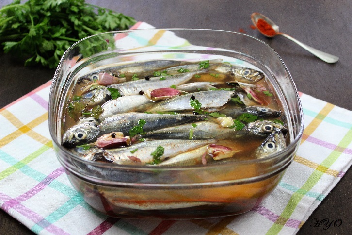 3. En un taper o recipiente hondo, vamos colocando los jurelitos ordenados. Una vez que tengamos una capa añadimos un poco del adobo y seguimos colocando el resto... Así hasta terminar. Agregamos un poco de agua fría para que el pescado quede completamente cubierto, y damos un pequeño meneo al táper para mezclar bien los sabores. Cerramos el táper o ponemos papel film y dejamos reposar en la nevera de un día para otro.