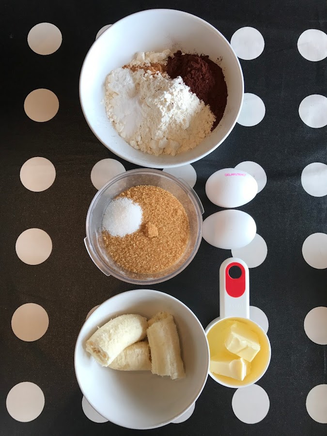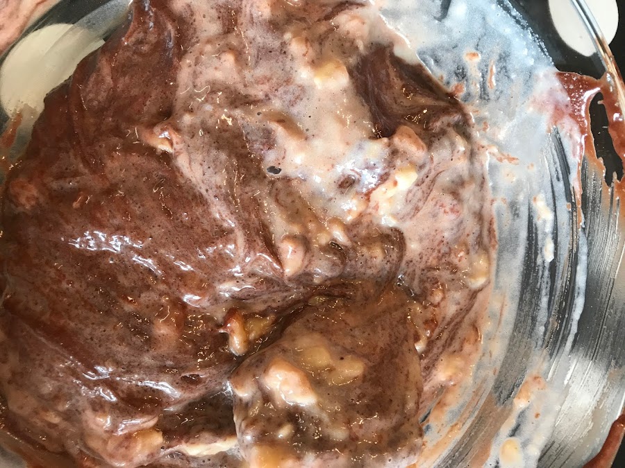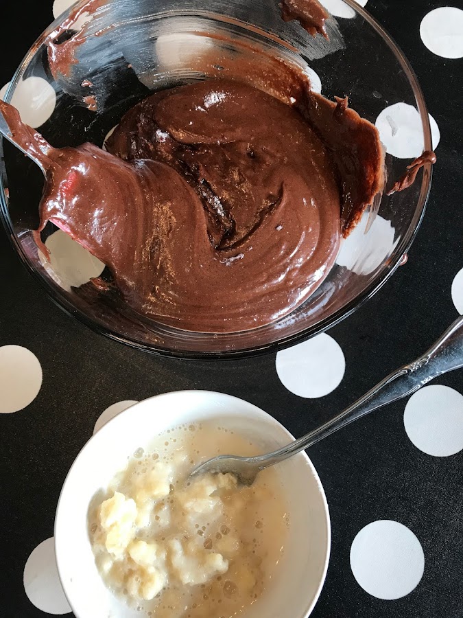 Mezclar hasta conseguir una consistencia cremosa y agregar los ingredientes secos. El plátano, lo machacamos con un tenedor añadiendo un poco de leche. Incorporamos esta mezcla a la masa de bizcocho y movemos con una pala hasta integrar suavemente.